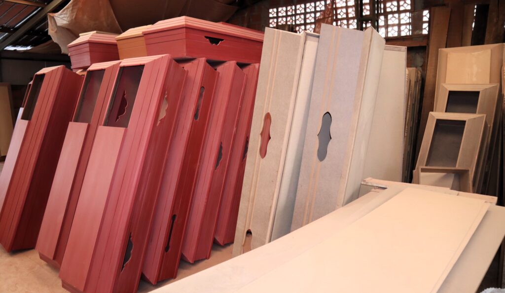 En nuestra fábrica, fusionamos habilidades artesanales con tecnología de vanguardia para crear ataúdes personalizados y estándar que reflejan calidad y respeto. Nos dedicamos a ofrecer productos que cumplen con los más altos estándares de excelencia y satisfacen las necesidades únicas de las funerarias y cementerios.